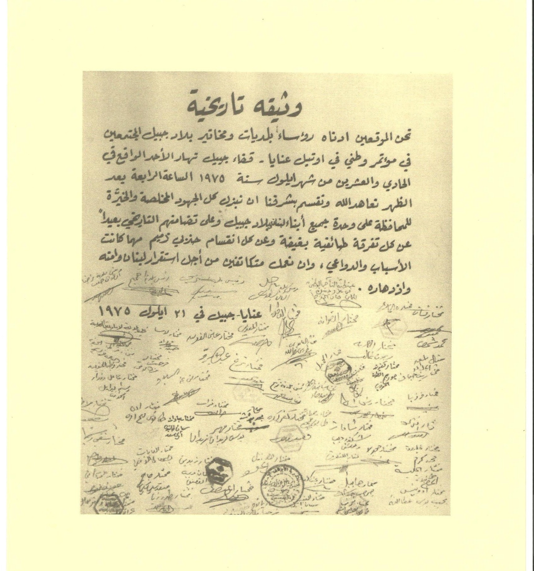 لقد كانت بلاد جبيل وكسروان السبَّاقة دائماً للعيش المشترك وللوحدة الوطنيّة بين عائلاتها الروحيّة في القرن العشرين وفي مطلع القرن الواحد والعشرين. وما حدث بين عائلتي آل سيف الدين من بلدة لاسا وآل خليل من بلدة حراجل ومن أهالي البلدتين الكريمتين ورجال الدين والمخاتير ورئيسي البلديتين في القريتين الآنفتي الذكر ومواقف الرئيس العماد ميشال عون وكتلة نوابه في قضاءي جبيل وكسروان وموقف سماحة الأمين العام لحزب الله العلاّمة السيّد حسن نصر الله وموقف اللقاء العلمائي في جبل لبنان وشماله لهو خير دليل على ما نقول. غير أنّ أبناء المنطقة أرادوا ترجمة ذلك كتابة وتدويناً كلما سمعوا طبول الحرب والفتنة تقرع عند اخوانهم في المناطق اللبنانيّة الأخرى. كما حدث في توقيعهم لميثاق عنّايا الشهير في 21 أيلول 1975م. بسعي من المحامي الأستاذ جان حوّاط والحاج محمود جعفر المولى وبإرشاد وتوجيه من الإمام السيّد موسى الصدر ومفتي بعلبك الشيخ سليمان اليحفوفي والعميد ريمون إده والدكتور انطوان الشاميّ والمطران عبد الله نجيم وتوقيعهم لميثاق آخر يؤكد الميثاق الأوّل في منزل الرئيس أديب علاّم في عين الدلبة ـ جبيل في 27 شباط 1976 حيث كان من أبرز الموقعين عليه: الرئيس أديب علاّم والرئيس عبد الله حمود ناصر والرئيس وفيق الحساميّ والشيخ رفيق الخازن والعميد سيمون سعيد والدكتور فيليب متى وأسعد جرمانوس والمحامي اميل يزبك وغيث خوري وسامي الهاشم ولويس القرداحي والسيدة نهاد سعيد وجورج بطرس كرم والمحامي محمد حيدر أحمد والمحامي السيّد عصمت الحسينيّ وحسن المقداد المعروف بأبي طعّان وعادل ابراهيم عوّاد وغيرهم من الفعاليات الجُبيليّة الكسروانيّة.