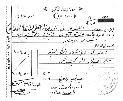 إيصال قبض مالي بمبلغ عشرة آلاف وأربعمائة وخمسين قرشاً سورياً لا غير لحساب شق الطريق من غباله إلى يحشوش سنة 1926م. من شيخ صلح المعيصرة.