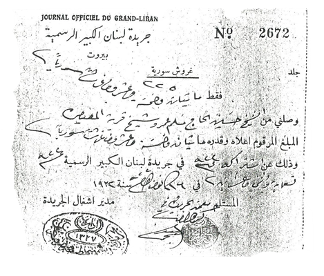 ايصالان ماليان بدل اشتراك من مختار المعيصرة بجريدة لبنان الكبير الرسميّة عن عامي 1922 ـ 1923م.