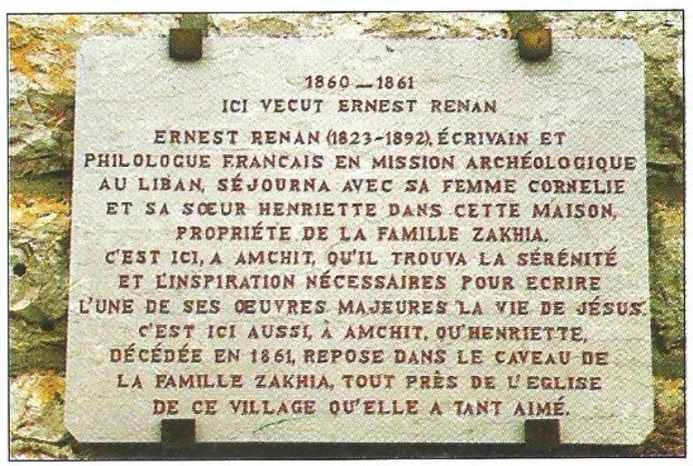 وكتبت عائلة طوبيا زخيا وفاءً لهذه الراحلة على باب الحجرة التي إحتضنت جثمانها، العبارة الجنائزية التالية: هنا في عمشيت ترقد (الفرنسية) هنرييت رينان المتوفاة عام 1861م، في مدافن عائلة زخيا قرب كنيسة القرية التي أحبتها كثيراً(44).