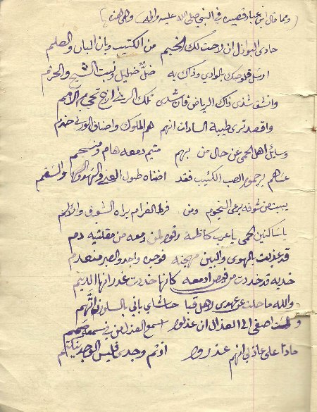 صورة لصفحة من كتاب صغير مخطوط للشيخ حسن محمود الزين(1) من المغيري (قضاء جبيل) وهذه القصيدة للوزير العبّاسي الصاحب بن عبّاد في مدح النبيِّ محمدP، وقد جمع في هذا الكُتيب بعض القصائد وبعض الأحاديث والأخبار الواردة في فضائل النبيّ وآل بيته(صلوت الله وسلامه عليهم أجمعين) ممّا يحتاجه قارئ العزاء الحسينيّ ومدّرس القرآن الكريم في قرية المغيري وجوارها أيام متصرفيّة جبل لبنان.