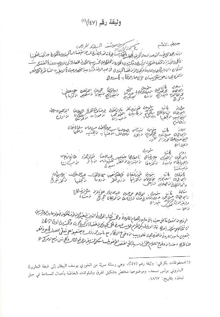من كتاب «المسلمون الشيعة في كسروان وجبيل» للدكتور علي راغب حيدر أحمد ص 530 وهو وثيقة رقم (47 أ) من محفوظات بكركي، وهي رسالة من الخوري يوسف البيطار إلى غبطة البطريرك المارونيّ بولس مسعد مختص بتشكيل الفرق والبلوكات الخاصة بأعمال المساحة في جبل لبنان. وهذه الرسالة فيها تزكيّة للأعضاء الشيعة الآنفي الذكر في هامش الوثيقة الأولى. واختيار أعضاء موارنة من قضاء البترون. وأعضاء من باقي الطوائف في متصرفيّة جبل لبنان بتزكيّة من الخوري الآنف الذكر. بتاريخ 1867.