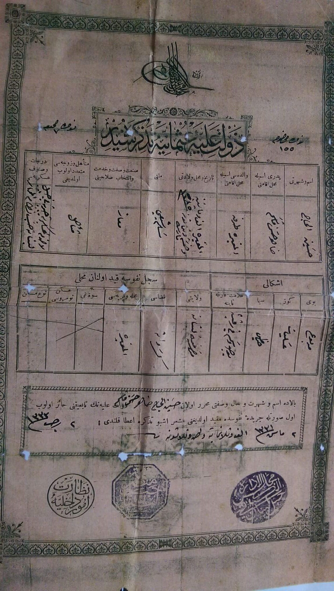 هوية المرحوم حسين الحاج ضاهر حسن قاسم. مواليد قرية المغيره 1285هـ. الموافق لعام 1868م. وقد أُعطيت له في الثاني من شهر رجب الواقع فيه 1333هـ. الموافق لعام 1914م.وهي تثبت إنتسابه للهوية العثمانيّة ولمتصرفيّة جبل لبنان وبالتالي عدم خضوعه قانوناً للتجنيد الإجباري حسب نظام متصرفيّة جبل لبنان للرعايا العثمانيين.