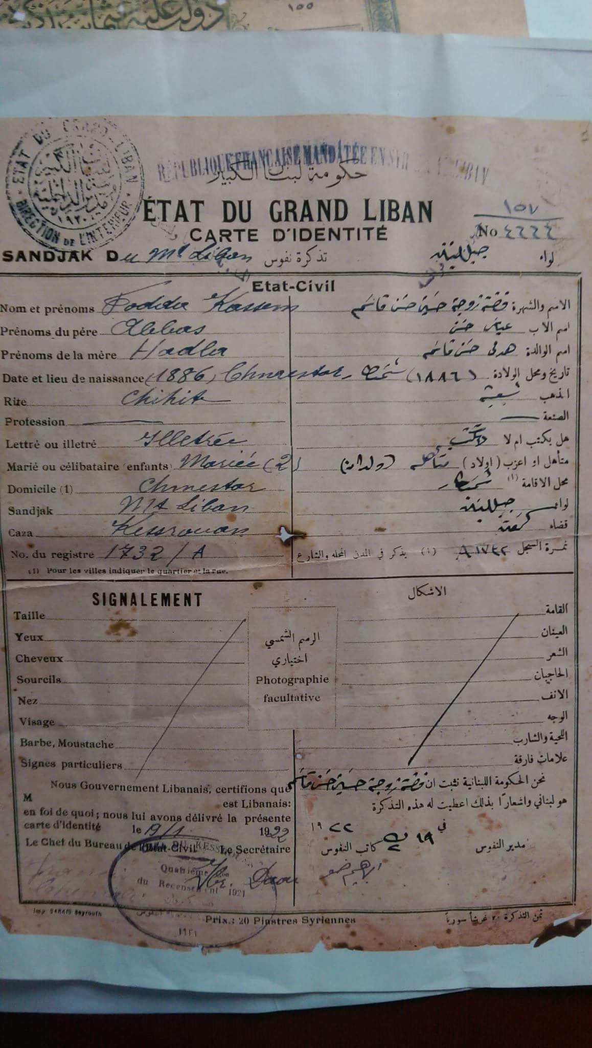 هوية المرحومة فضة عباس حسن زوجة المرحوم حسين الحاج ضاهر حسن قاسم الآنف الذكر. مواليد شمسطار 1886م. قضاء كسروان ـ لواء جبل لبنان. حكومة لبنان الكبير ـ أُعطيت لها هذه التذكرة في 19 كانون الثاني 1922م.