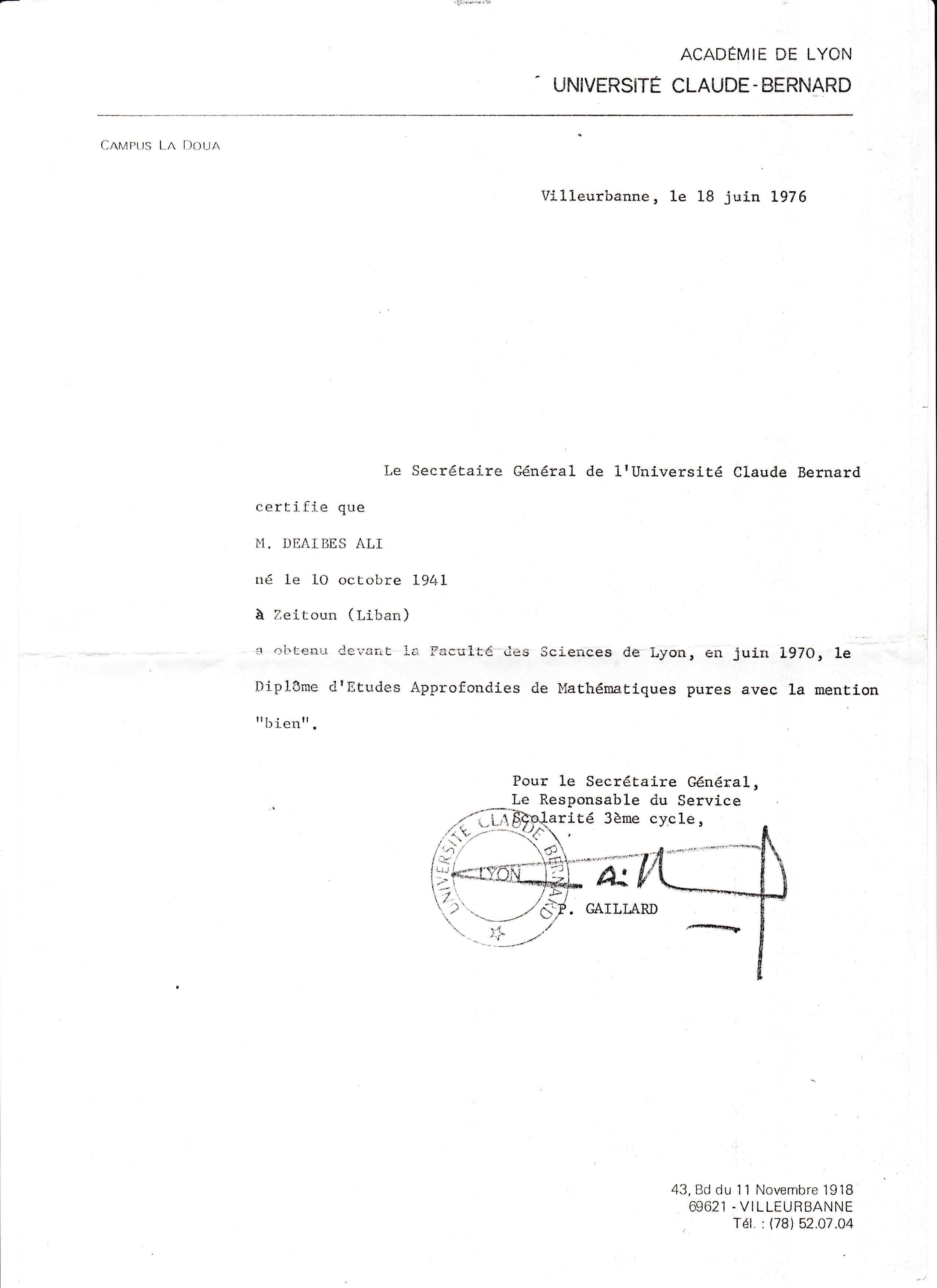 أقول جواباً على سؤالكم الثالث: كان قدومي إلى مدينة ليون في فرنسا في الرابع عشر من تشرين الأوّل سنة ١٩٦٩، حيث تسجلّت في دبلوم الدراسات المُعمّقة في الرياضيات البحتة. وقد وجدت أنّه ينقصني الكثير في مجال اللغة وفي المجالات الرياضيّة، فرحت أخصّص جلّ وقتي لسدّ النواقص باللغة الفرنسيّة ومتابعة دروس ما يُلقى علينا من محاضرات والبحث عن موضوع أكتب عنه دراسة يتوجّب عليّ النقاش والدفاع عنها في آخر العام الدراسي.