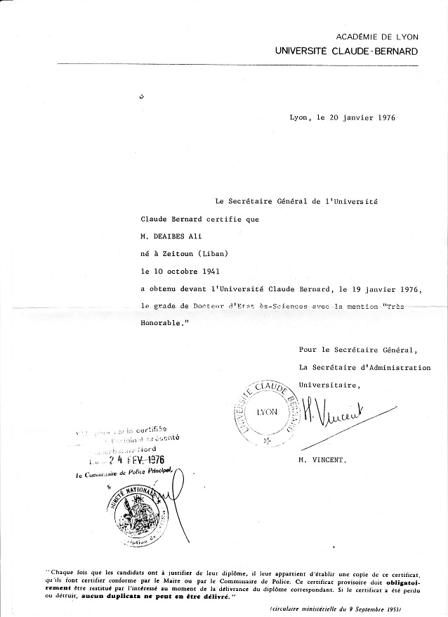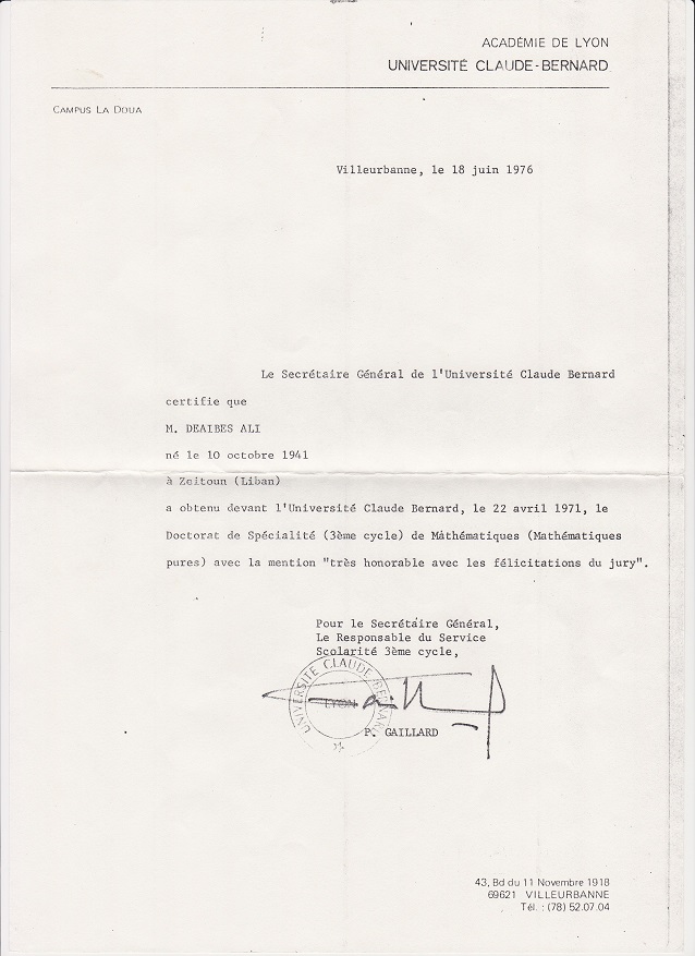 بعد حصولي على هذه الشهادة خيّروني في كليّة العلوم في الجامعة اللبنانيّة بين الحصول على مركز مُعيد في الكليّة أو تحضير دكتوراه دولة في فرنسا، اخترت تحضير دكتوراه دولة، وهكذا فقد عُدّت إلى مدينة ليون ورحت أعمل في مجال البحث، وبعد سنة أعطوني مركز أستاذ مساعد في الجامعة فرحت أُدرّس وأبحث. وبعد أربع سنوات تمكّنت من الحصول على دكتوراه دولة في الرياضيات، وبعد ذلك بعام عدّت إلى بيروت حيث تمّ تفريغي كأستاذ مساعد في قسم الرياضيات.