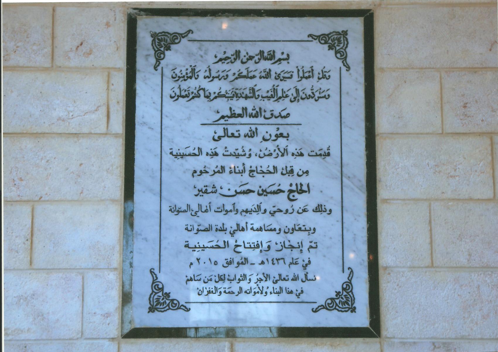 بدعوة من أبناء المرحوم الحاج حسين حسن شقير وأهالي بلدة الصوانة ـ قضاء جبيل، تمَّ إفتتاح حسينيّة أهل البيت (ع)، ظهر يوم الأحد الواقع فيه أوّل تشرين الثاني 2015م. برعاية سماحة الإمام الشيخ عبد الأمير قبلان مثلّاً بولده المفتي الجعفريّ الممتاز الشيخ أحمد قبلان. حضر الإحتفال حشد من الأهالي والوجهاء والفعاليات الدينيّة والسياسيّة والأمنيّة والإجتماعيّة يتقدمهم الرئيس السابق للمحكمة الشرعيّة الجعفريّة العليا العلاّمة الشيخ حسن عوّاد، المفتي الجعفريّ لبلاد جبيل وكسروان الشيخ عبد الأمير شمس الدين، المفتي الجعفري لبلاد بعلبك الشيخ خليل شقير، قاضي جبيل الشرعي الجعفري الدكتور الشيخ يوسف محمد عمرو، الشيخ غسّان اللقيس إمام المركز الإسلاميّ في جبيل، الشيخ عصمت عباس عمرو مسؤول الأوقاف الجعفريّة في فتوح كسروان، الشيخ مصطفى قماطي إمام بلدة الصوانة، الشيخ رمزي شمص إمام بلدتي عين جران وعين الدلبة، الشيخ حسين شمص رئيس المؤسسة الخيريّة الإسلاميّة لأبناء جبيل وكسروان، الشيخ بسّام العيتاوي، الشيخ محمد أحمد حيدر إمام بلدة زيتون، النائب الحاج عباس هاشم، الشيخ علي برّو مسؤول منطقة جبيل وكسروان في حزب الله، الدكتور محمد داغر المسؤول التنظيمي لحركة “أمل” في جبل لبنان، الأستاذ السيد مصطفى الحسينيّ، الدكتور رباح أبي حيدر، الحاج عفيف الزيّات عضو الهيئة الإداريّة في جمعية المبرّات الخيريّة، الدكتور عفيف عوّاد، الدكتور سمير حيدر أحمد ورؤساء بلديات ومخاتير قرى وغيرهم من الفعاليات وجمع من الأهالي.