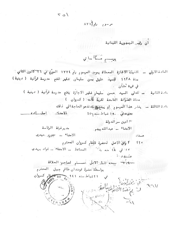 وهكذا كان، حيث صدرت الرخصة بموجب المرسوم رقم 1774 المؤرخ في 26 كانون الثاني 1938 بفتح مدرسة قرآنيّة (دينيّة) في قرية مشّان.