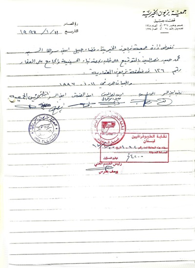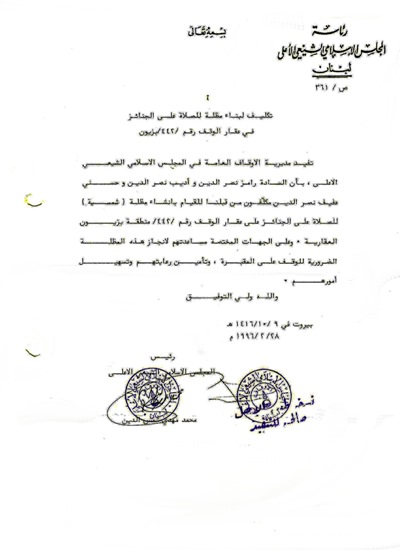 كما كان للحاج رامز اليد البيضاء والسبق مع كل من الأستاذ أديب وحسني نصر الدين ببناء المصلى على العقار رقم: 442 في منطقة بزيون العقاريّة محلة حرشه بتكليف رسمي من رئاسة المجلس الإسلاميّ الشيعيّ الأعلى رقم: 361/ص/صادر في 28/2/1996م.