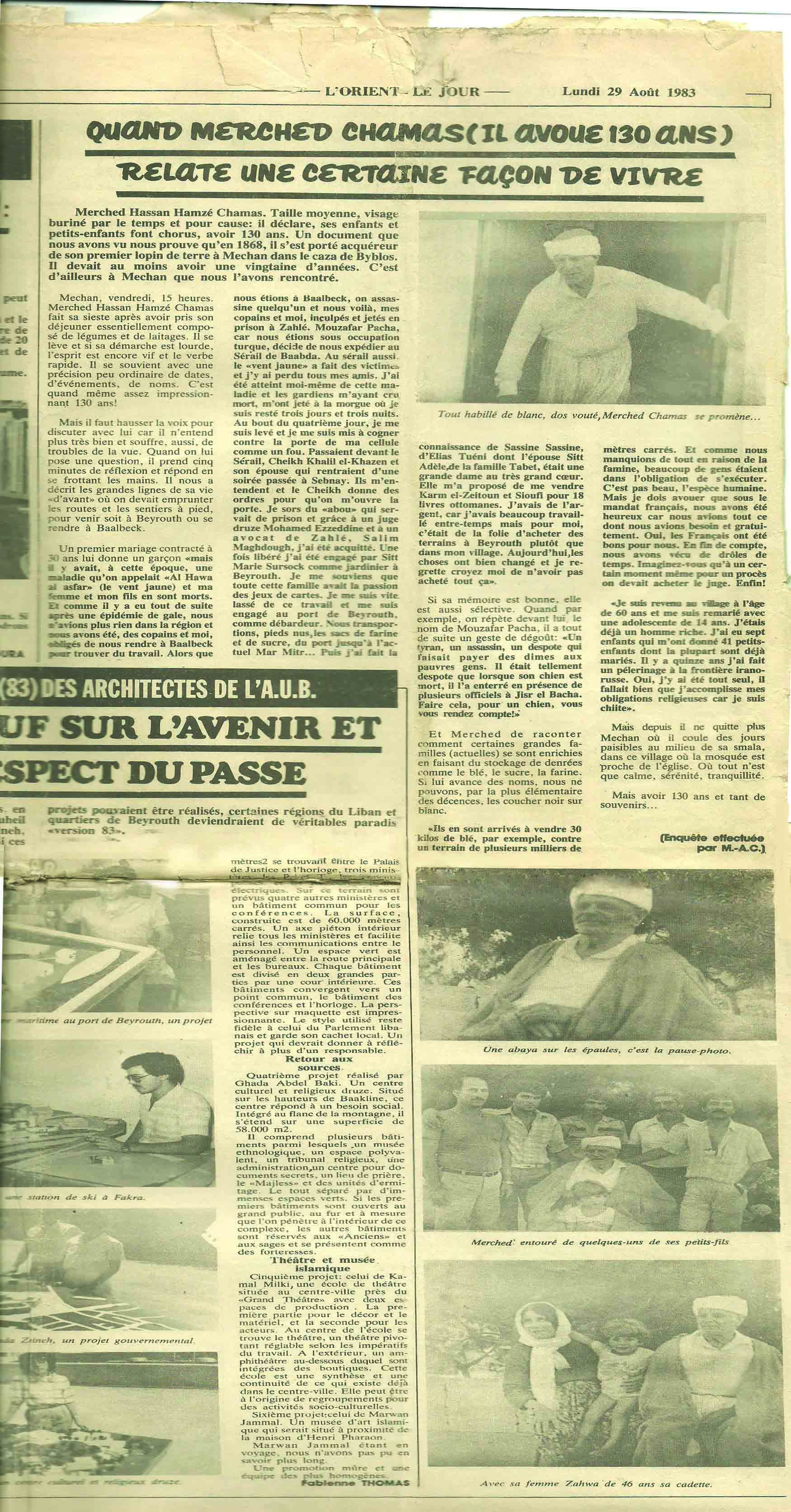 ولكن عند التحدّث معه، كان علينا أن نرفع صوتنا لأنه لا يسمع جيداً، وكان يُعاني من اضطرابات في الرؤية. وعندما نطرح عليه سؤالاً كان يستغرق خمس دقائق للتفكير، ويجيب وهو يفرك يديه . ووصف لنا الخطوط العريضة من حياته «قبل» عندما كان يجب أن نعبر الطرق والممرات للذهاب الى بيروت أو للعودة إلى بعلبك، سيراً على الأقدام.
