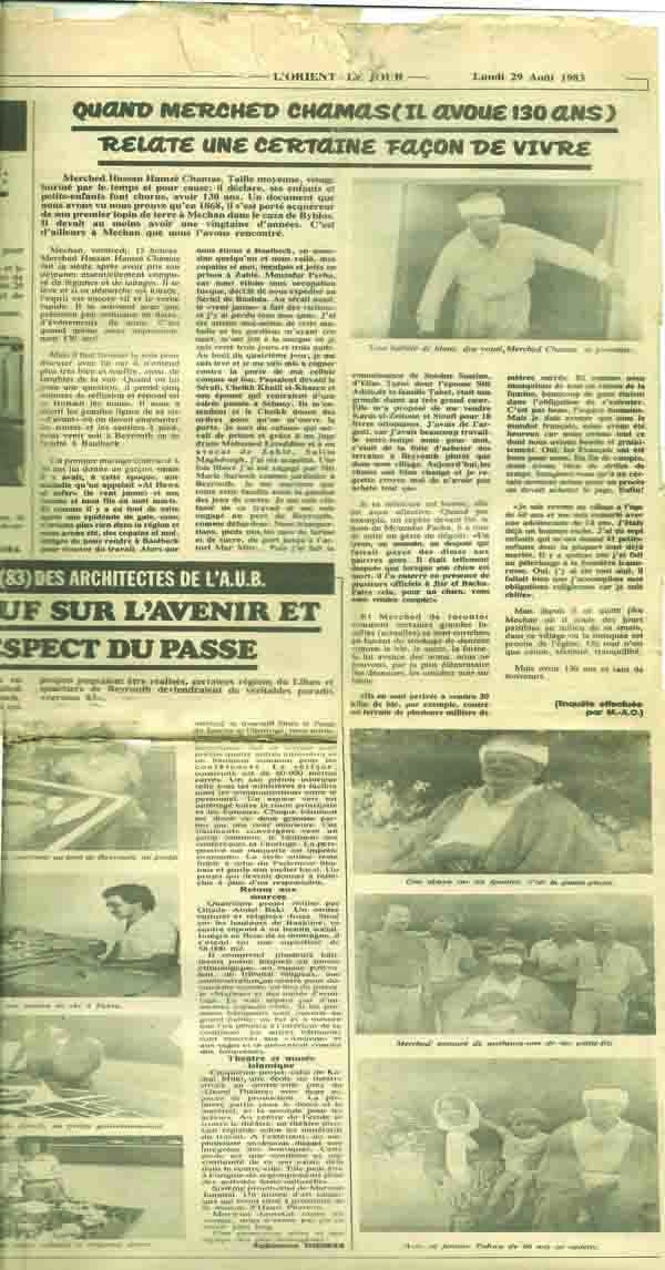 «على سبيل المثال، لقد توصلوا الى بيع ثلاثين كيلو من القمح لقاء أرض من آلاف الامتار المربعة. ونظراً إلى أنّنا كنّا نفتقر إلى كل شيء بسبب المجاعة، اضطرَّ كثير من الناس للخضوع إلى الأمر الواقع . ما أبشع هذا الإنسان! ولكن يجب أن أعترف أنه في ظل الانتداب الفرنسي، كنا سُعداء لأننا كنا نحصل على كل ما نحتاجه ومجاناً. نعم، لقد استفدنا من الفرنسيين. وفي نهاية المطاف، عشنا أوقاتاً مُضحكة. تخيل أنه في مرّةٍ اضطررنا إلى شراء سكوت القاضي لمحاكمة أحدهم. وأخيراً! « ثم عدتُ الى قريتي وأنا في الستين من عمري، وتزوجت مُجدداً من فتاة في الرابعة عشرة من عمرها. كنتُ رجلاً غنيًّا، ورزقت بسبعة أطفال وواحد وأربعين حفيداً، معظمهم متزوج. قبل خمسة عشر عامًا، سافرتُ الى الحدود الايرانية ـ الروسية لأداء زيارة الإمام عليّ الرضاQ. نعم كنتُ وحيداً، لانه كان من الضروري أن أقوم بواجباتي الدينية لأنني مُسلم شيعي».