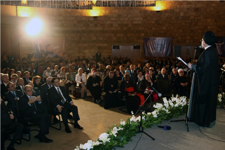 بدأ الإحتفال بقرع أجراس الكنيسة تناغماً مع رفع الأذان، ثُمّ تلا طفل مسيحي صلاة الأبانا وآخر مُسلم سورة الفاتحة، وتلا ذلك إنشاد ثنائي للشيخ يموتلي لسورة آل عمران وللأب شهاب عطا الله من انجيل لوقا. وألقى بعد ذلك الأمين العام للقاء ناجي الخوري كلمة ترحيبيّة، ثُمَّ أناشيد وموسيقى من وحي المناسبة لاوركسترا شباب الجمعيّة اللبنانيّة لنشر الموسيقى، رافقها عدد من المرنمين من جوقة الفيحاء. بعد ذلك تحدّث رئيس مدرسة سيّدة الجمهور الأب برونوسيون اليسوعي الذي رحب بالمشاركين، مؤكداً التزام المدرسة والآباء اليسوعيين القوي بهذا الحدث الواسع الأبعاد. ثُمّ نقل الكاردينال بيتر توركسون رسالة الفاتيكان التي أكدت الحرص على الوحدة والتقارب