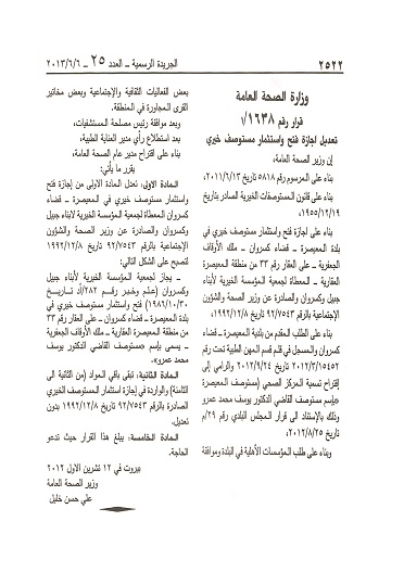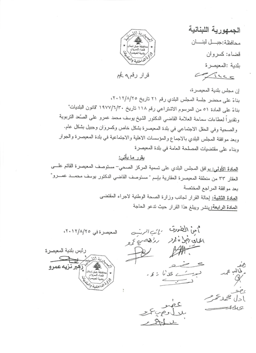 إنّ هيئة التحرير في مجلة «إطلالة جُبيليّة» تتوجه بالشكر والتهنئة لرئيس التحرير القاضي الدكتور يوسف عمرو ولجمعية «المؤسسة الخيريّة الإسلاميّة لأبناء جبيل وكسروان» وللأخوة الكرام في الهيئة الصحيّة الإسلاميّة، وأصحاب الفضيلة الشيخ محمد حسين عمرو، الشيخ عصمت عباس عمرو، الشيخ محمود طالب عمرو، الشيخ شريف حسين عمرو، الشيخ عبد اللطيف عمرو، الشيخ علي ترمس، الشيخ حسن قاسم عمرو ولرئيس بلدية المعيصرة الحاج زهير نزيه عمرو وللمجلس البلدي الكريم لإقتراحهم تسمية مستوصف المعيصرة مستوصف القاضي الدكتور يوسف محمد عمرو ذلك في الجلسة رقم 29/م في 25/8/2012م. كما نتوجه بالشكر لأهالي بلدة المعيصرة ولجمعية آل عمرو الخيريّة وللجمعيات الأهليّة في المعيصرة وللفعاليات الثقافيّة والإجتماعيّة وبعض مخاتير القرى المجاورة ولسعادة النائب الحاج عباس هاشم. كما نتوجه بالشكر للسادة الأطباء العاملين في المستوصف بشكل عام وللدكتور زخيا الخوري بشكل خاص، لمدير المستوصف الأخ محمد طالب عمرو، للممرضة المسؤولة السيدة شهيرة عدنان عمرو. على صدور القرار الوزاري بذلك من معالي الوزير علي حسن خليل تحت رقم: 1638/1 في 12/10/2012م. سائلين الله تعالى أن يطيل بعمر القاضي الدكتور الشيخ عمرو ويحفظه سنداً للتربية وللعلم والوحدة الوطنيّة. وأن يرحم المرحوم والده الحاج محمد جعفر عمرو مؤسس هذا المستوصف في عام 1983م