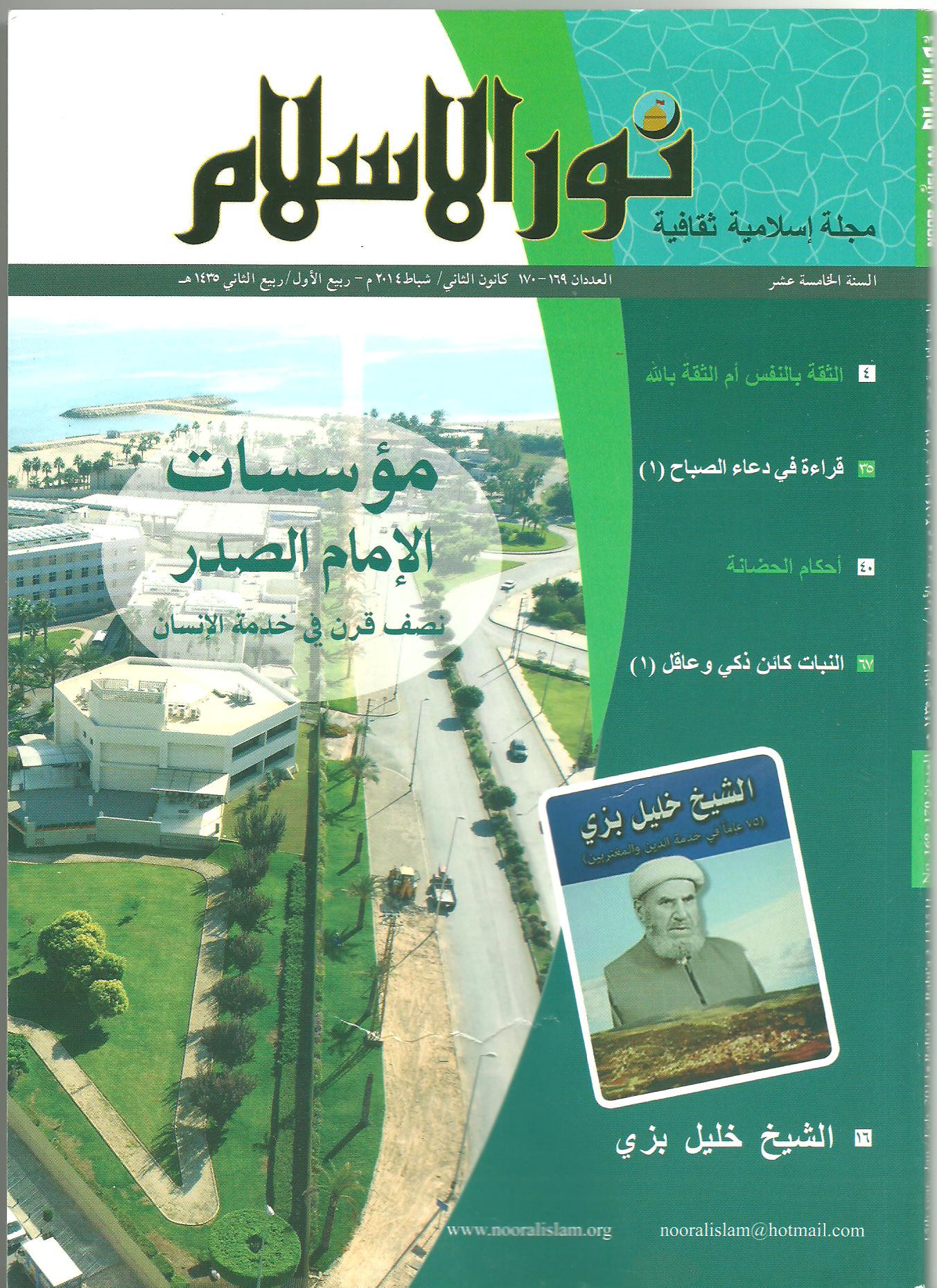 ــ صدر العددان: 169 ـ 170 من مجلة «نور الإسلام» الصادرة في بيروت عن كانون الثاني وشباط 2014م. وهي باللغتين العربية والإنكليزيّة. رئيس تحريرها الدكتور السيّد حسين الحكيم. وقد تضمّن هذا العدد تحقيقات وبحوثاً قيّمة. أهمها: التربيّة في الدين للعلاّمة السيّد حسين إسماعيل الصدر. وقراءة في دعاء الصباح للدكتور يحيى الشاميّ، والثقة بالنفس أم الثقة بالله للسيّد مرتضى السيّد حيدر شرف الدين. وأحكام الحضانة (فقه ميّسر) طبقاً لفتاوى الإمام السيّد علي السيستانيّ}. وترجمة لحياة المجاهد الشيخ خليل بزي للدكتورة باسمة شامي بزي الذي كان مرشداً وواعظاً للمسلمين الشيعة في ولاية ميشيغان في ضاحية ديربورن وسائر الولايات المتحدة الأمريكيّة منذ عام 1913م. ولغاية وفاته في عام 1988م. تقرباً إلى الله تعالى، ودون مقابل، كما تكلّمت عن ثقة الجالية اللبنانيّة به وعن ثقة مراجع النّجف الأشرف به وعن تأسيسه لأوّل مسجد إسلاميّ شيعيّ في الولايات المتحدة. وعن إقامته للشعائر والمناسبات الدينيّة. كما تضمن العدد أيضاً تحقيقاً جميلاً عن مؤسسات الإمام الصدر في لبنان خلال نصف قرن وغيرها من مواضيع مفيدة.